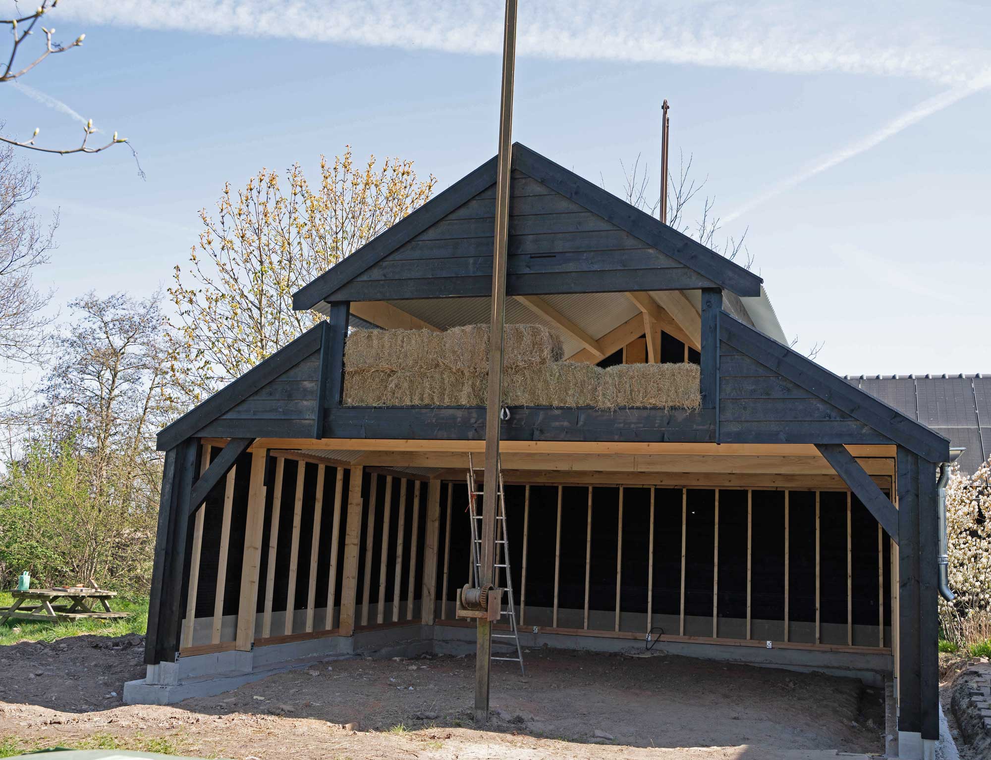 De oude hooiberg afgebroken maar de stalen palen die zorgden voor het heffen van het dak hebben we laten staan. Oud en nieuw gecombineerd. De wanden zijn opgebouwd uit rabatdelen. De schuur biedt nu ruimte voor auto’s en tuingereedschap.