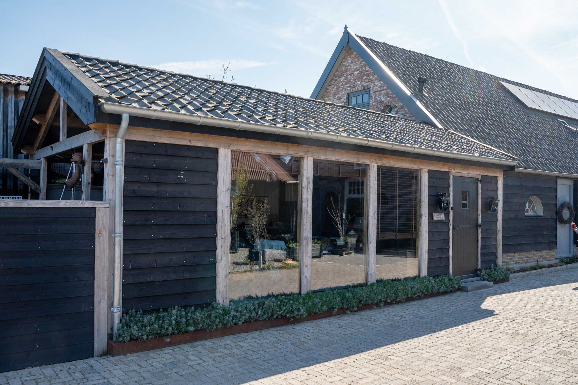 De wens bij de verbouwing was dat het perfect zou passen bij de landelijke sfeer van het terrein. Om nieuw met de oude delen te laten samenvloeien. De entree is modern uitgevoerd met verticale houten latjes. Een zogenaamde blinde deur erin verwerkt.
